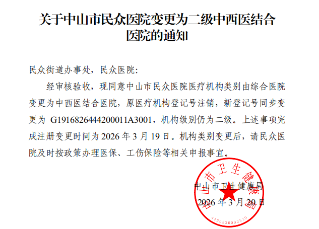 近日,中山市民眾醫(yī)院繼2024年成功晉升二級綜合醫(yī)院后,于3月19日獲批轉型為二級中西醫(yī)結合醫(yī)院。這標志著醫(yī)院實現連續(xù)“上臺階、轉賽道”的跨越式發(fā)展,中醫(yī)藥服務能力全面提檔升級,邁入中西醫(yī)協同高質量發(fā)展新階段。