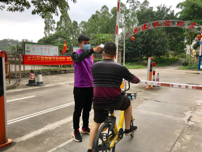 退役在校大學生何波堅守疫情防控一線 被評為五桂山十佳志愿服務(wù)明星  何波在小區(qū)門崗測量體溫。