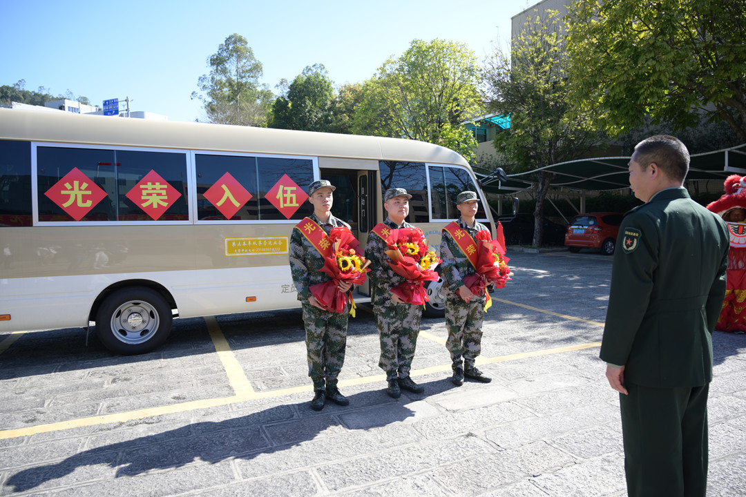 葉陽浩、胡家威兩名準新兵身披“光榮入伍”的紅色綬帶和大紅花昂首挺胸站在太陽下,新兵家屬前來歡送。“陽浩的堂叔叔、外公和叔公都曾應征入伍,他能進部隊得到鍛煉,我們作為他的父母感到很光榮、很幸福。”葉陽浩的父母胸戴“光榮家屬”的大紅花,露出激動的笑容。
