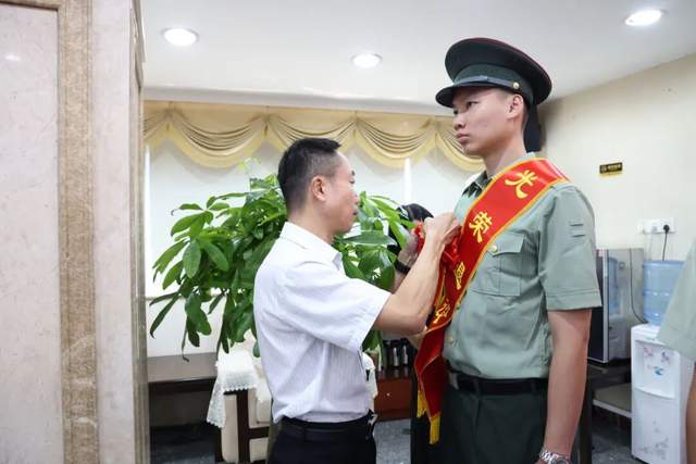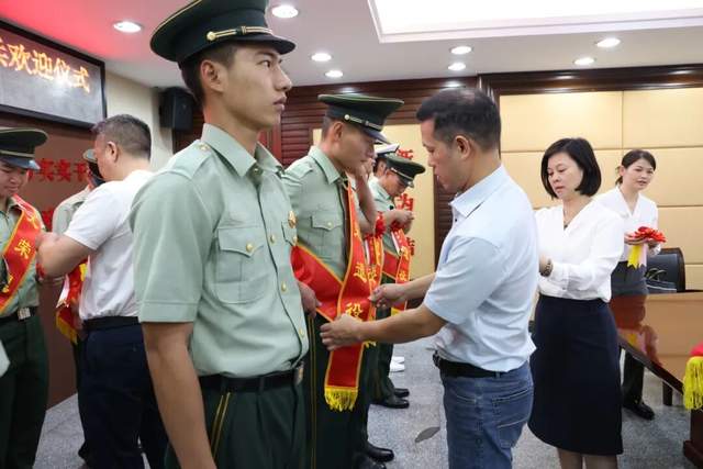 儀式現(xiàn)場,街道領(lǐng)導(dǎo)為退役士兵逐一佩戴象征榮譽(yù)的大紅花,致敬他們?yōu)閲朗聵I(yè)作出的貢獻(xiàn)。