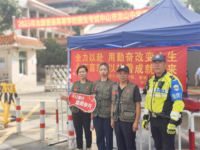 三鄉(xiāng)鎮(zhèn)退役軍人志愿者和民兵在桂山中學(xué)考場(chǎng)提供安保服務(wù)。