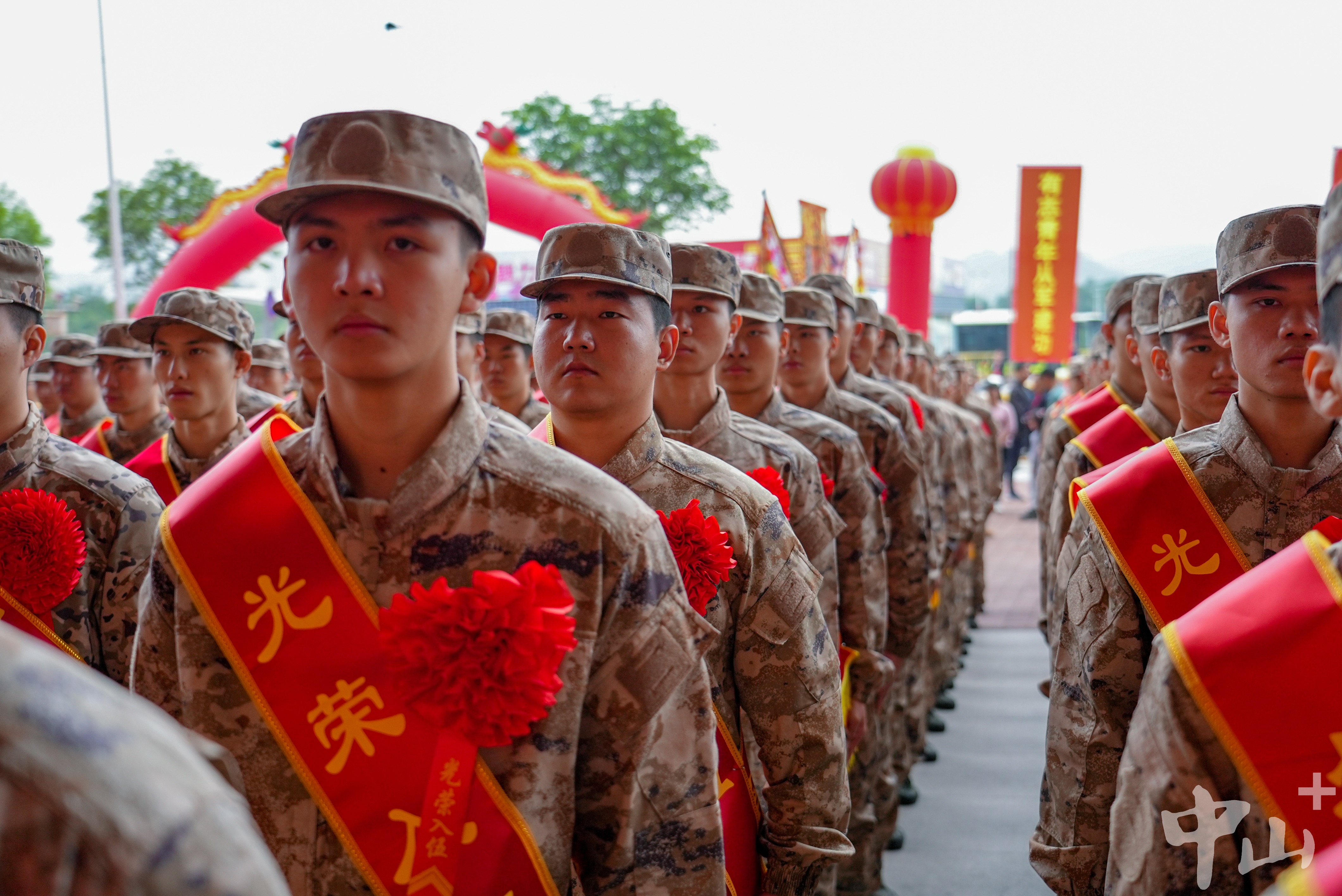 中山市征兵工作領導小組副組長、中山軍分區(qū)大校司令員李云濤,中山市征兵工作領導小組副組長、中山軍分區(qū)大校政治委員朱月明,市征兵辦副主任、市政府副秘書長梁克等出席大會。 歡送現(xiàn)場,新兵們戎裝整肅,身披“光榮入伍”的紅色綬帶,胸戴紅花,精神抖擻、軍姿挺拔。   新兵們戎裝整肅,精神抖擻、軍姿挺拔。記者 易承樂 攝