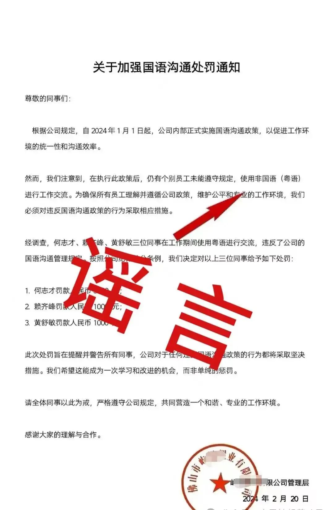 經查,網傳的消息為不實信息,系劉某杰(男,21歲,網傳涉事公司負責人)為吸引眼球、博取流量而編造并傳播。劉某杰的公司實際上只有其一人,沒有其他員工,不存在所謂員工因講粵語被罰款的情況。