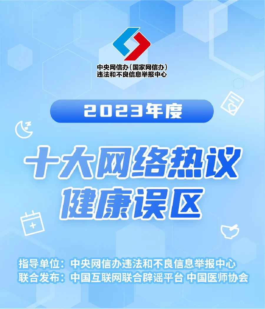 為守護人民群眾生命健康,中國互聯(lián)網(wǎng)聯(lián)合辟謠平臺、中國醫(yī)師協(xié)會聯(lián)合發(fā)布《2023年度十大網(wǎng)絡熱議健康誤區(qū)》,澄清醫(yī)療健康、飲食營養(yǎng)、科學運動等方面的誤區(qū),幫助網(wǎng)民提升識謠辨謠能力。