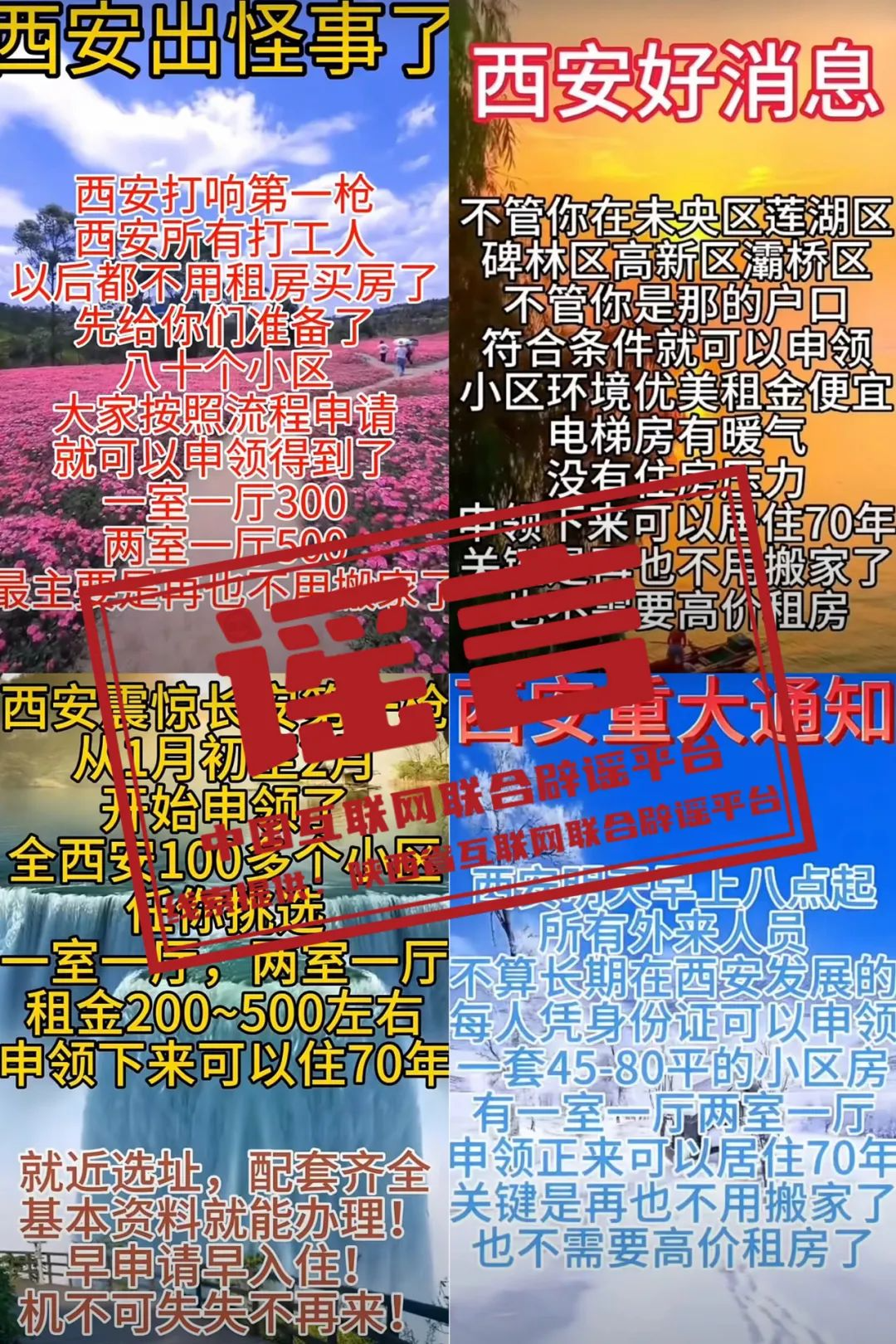 真相:近期,自媒體平臺上出現(xiàn)以“西安緊急通知”“西安出怪事了”等夸大性、煽動性話語為標(biāo)題,散播“憑身份證就可申領(lǐng)”“全西安市100多個小區(qū)任你挑選”“一次申領(lǐng)可以一直居住”等模糊性、誘導(dǎo)性內(nèi)容的信息。對此,西安市保障性住房管理中心發(fā)布聲明回應(yīng)稱,以上內(nèi)容均為不實信息,是對西安市公租房政策的歪曲理解和斷章取義。該聲明還特別提醒網(wǎng)民:有關(guān)西安市保障房政策、房源等相關(guān)信息,均以西安市住建局官方媒體發(fā)布的信息為準(zhǔn)。(來源:陜西省互聯(lián)網(wǎng)聯(lián)合辟謠平臺、“西安住建”微信公眾號)
