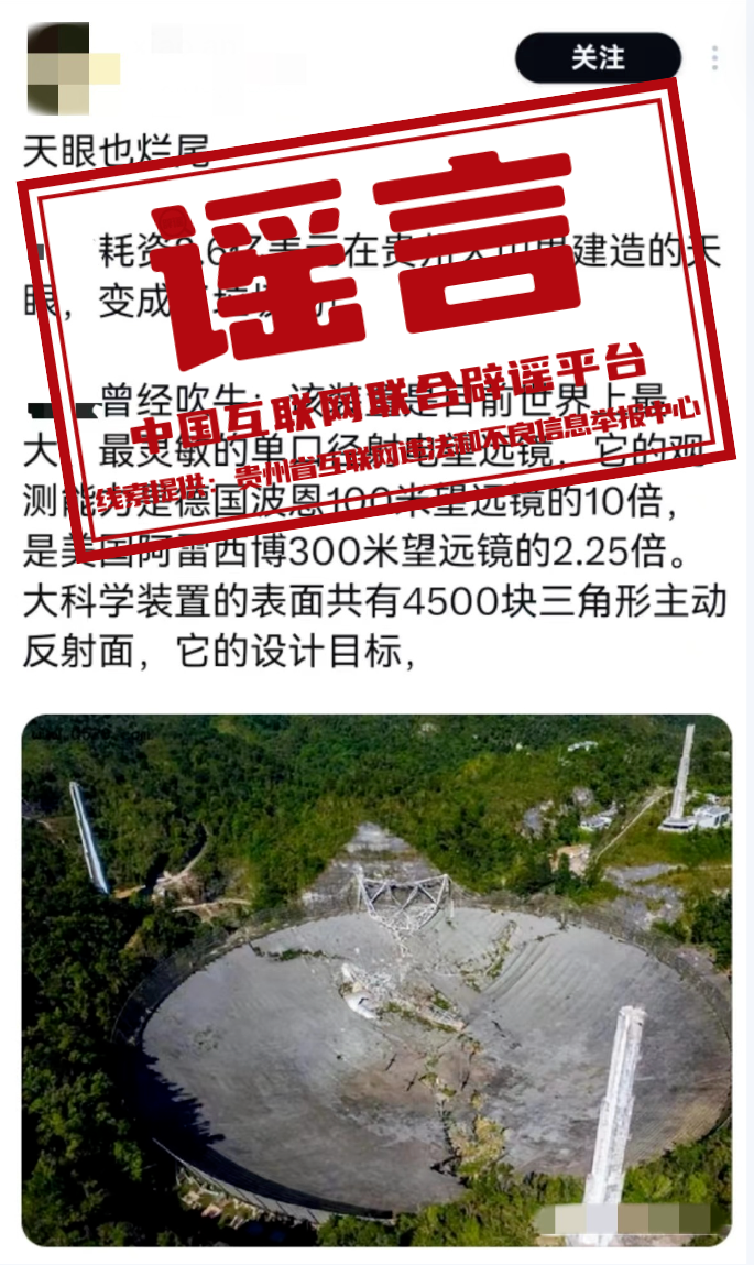 真相:近日,海外社交平臺(tái)有網(wǎng)民發(fā)布一張圖片,聲稱“耗資2.6億美元在貴州大山里建造的天眼,變成了垃圾場(chǎng)!”對(duì)此,“貴州辟謠”官方微信公眾號(hào)發(fā)布消息稱,網(wǎng)傳說法為謠傳,網(wǎng)傳圖片實(shí)為美國波多黎各的阿雷西博天文臺(tái)(Arecibo Observatory)于2020年12月發(fā)生徹底坍塌的畫面,該天文臺(tái)主要的觀測(cè)裝置為阿雷西博射電望遠(yuǎn)鏡。事實(shí)上,這并非“中國天眼”第一次“被坍塌”,2020年阿雷西博望遠(yuǎn)鏡第一次出現(xiàn)嚴(yán)重?fù)p壞之際,網(wǎng)絡(luò)中就曾出現(xiàn)過類似謠言。