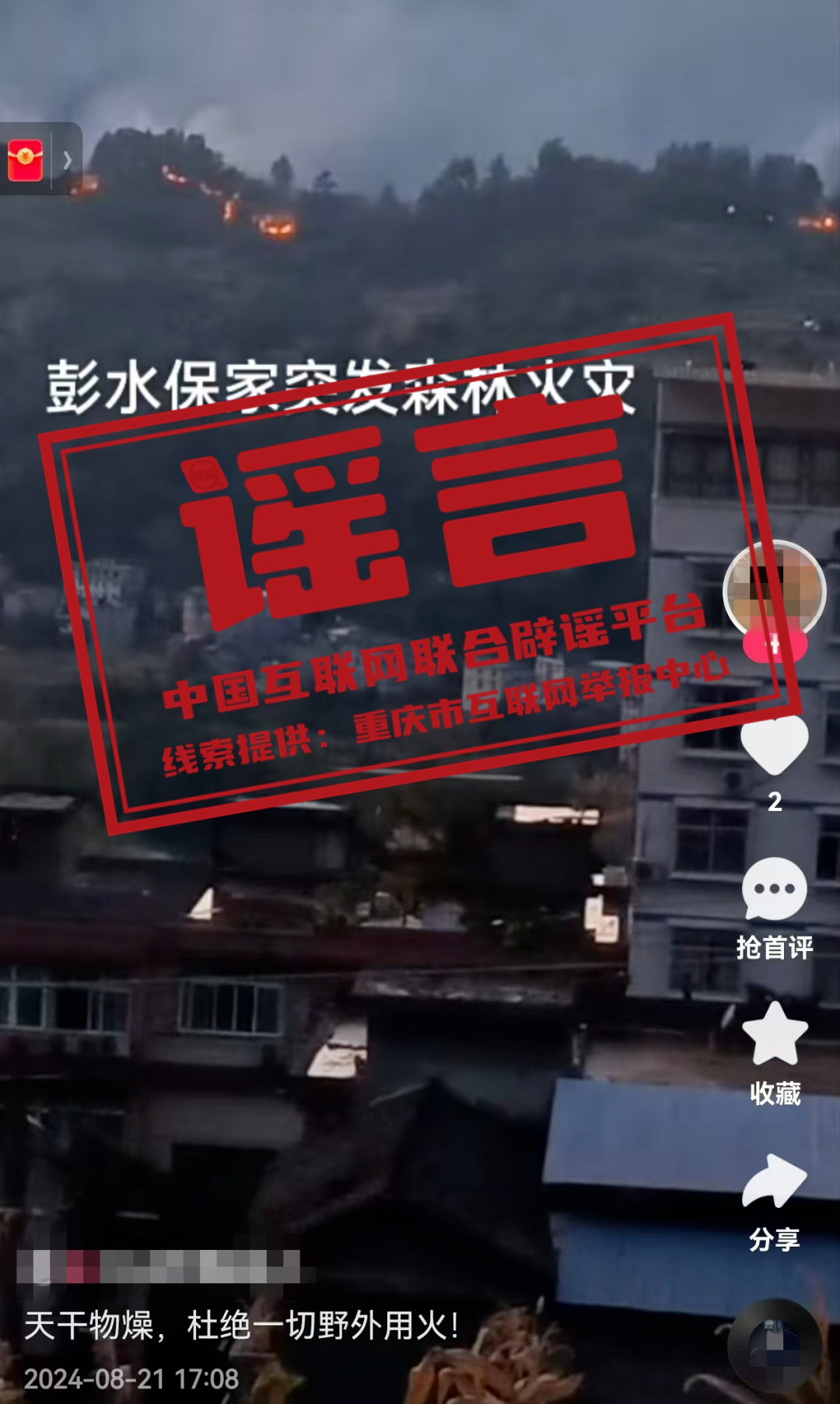 真相:8月21日,某網(wǎng)民發(fā)布視頻并配文“彭水保家突發(fā)森林火災(zāi)”,引發(fā)關(guān)注。經(jīng)屬地網(wǎng)信部門核實,重慶彭水近期未發(fā)生此類事件,網(wǎng)傳信息系謠言。目前,謠言線索已轉(zhuǎn)交相關(guān)部門對造謠者進行進一步調(diào)查處置。(來源:@重慶辟謠)