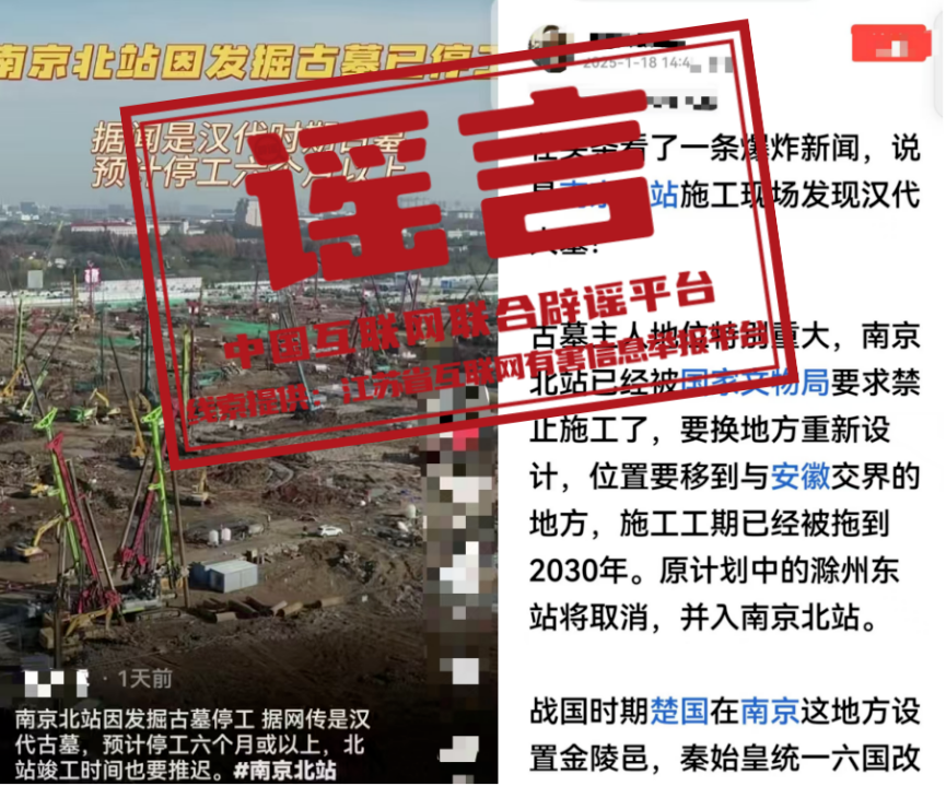 真相:近日,有網(wǎng)民在網(wǎng)絡(luò)平臺(tái)發(fā)帖稱,南京北站因挖到古墓,“已經(jīng)被國(guó)家文物局要求禁止施工了”“預(yù)計(jì)停工六個(gè)月或以上”“施工工期已經(jīng)被拖到2030年”等。經(jīng)江蘇省互聯(lián)網(wǎng)辟謠平臺(tái)與省文物部門和屬地核實(shí),目前沒有收到國(guó)家文物局關(guān)于“南京北站禁止施工”的有關(guān)通知,南京北站除個(gè)別涉及考古發(fā)掘作業(yè)區(qū)域外,其他施工作業(yè)均按計(jì)劃正常有序推進(jìn),網(wǎng)傳信息系謠言。(來源:江蘇省互聯(lián)網(wǎng)辟謠平臺(tái)、“南京網(wǎng)絡(luò)辟謠”微信公眾號(hào))