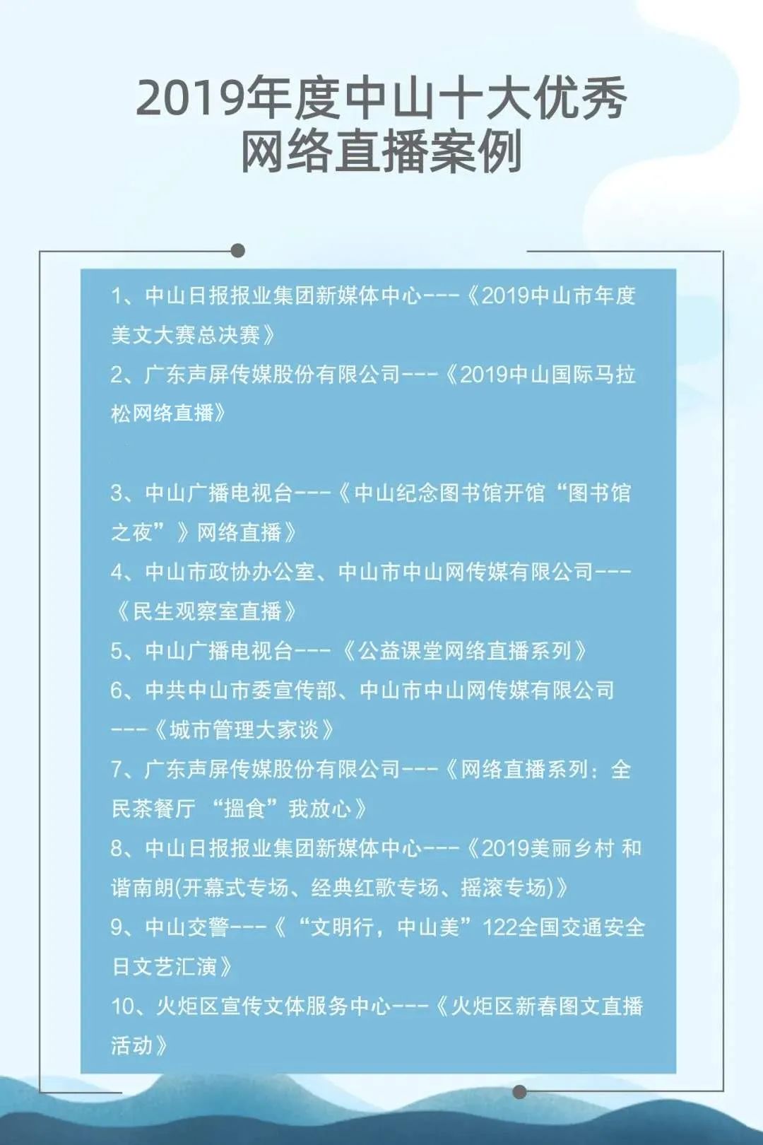 自2015年起,中山市網(wǎng)絡(luò)文化協(xié)會聯(lián)合中山日報報業(yè)集團(tuán)、人民網(wǎng)輿情數(shù)據(jù)中心已連續(xù)成功舉辦了四屆中山新媒體影響力年度排行榜發(fā)布會。與此同時,自2017年起,中山廣播電視臺聯(lián)合新榜(上??窗裥畔⒖萍加邢薰荆┮惨呀?jīng)連續(xù)成功舉辦了三屆中山市新媒體頒獎盛典。兩個評選活動通過立標(biāo)桿、樹典型,有效促進(jìn)了中山新媒體的建設(shè)運(yùn)營水平,推動了中山新媒體的健康向上發(fā)展。